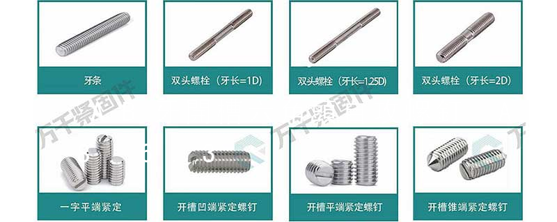 1.機螺釘 2.自攻螺釘 3.鉆尾螺釘 4.墻板釘 5.纖維板釘 6.木螺釘7.六角木螺釘 8.不脫出螺釘 9.組合螺釘 10.微型螺釘 11.家具螺釘 12.電子螺釘 13.鏈帶螺釘頭型 :1.六角頭(hexagon head)2.六角頭法蘭面(hexagon head with flange)3.方頭(square head)4.T形頭T head (hammer head5.